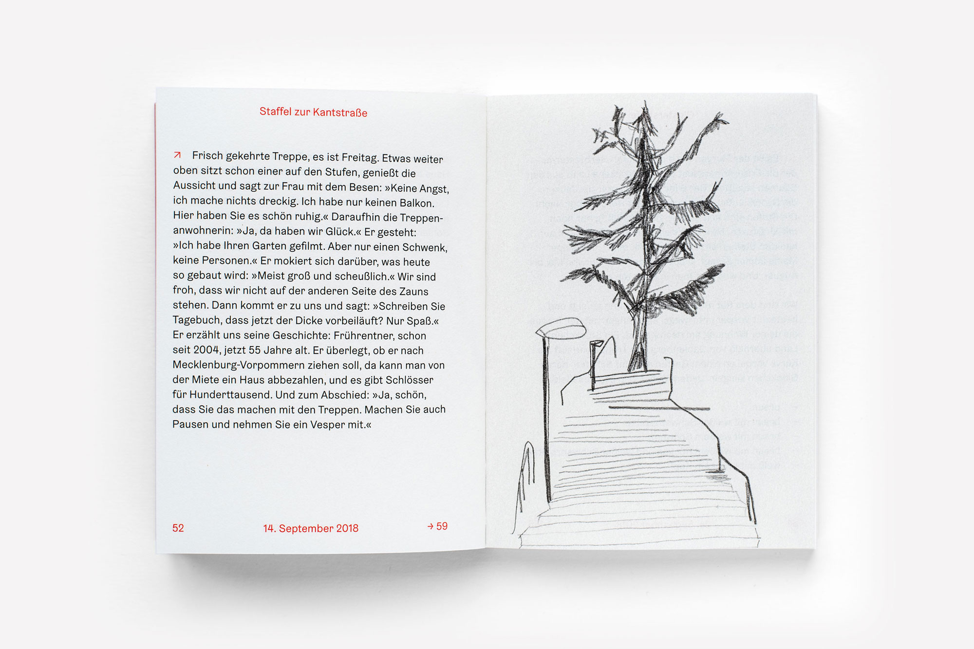 Über ein Jahr hinweg erklimmen Christina Schmid und Sabine Fessler die Stuttgarter Stäffele und verweilen auf ihnen. Sie beobachten, lauschen und protokollieren das Treppengeschehen zwischen den Ebenen im hügeligen Stuttgart. Die eine schreibt, die andere zeichnet. So entsteht nach und nach ein ganz eigener Blick auf diese grünen Oasen und Zwischenräume der Stadt.